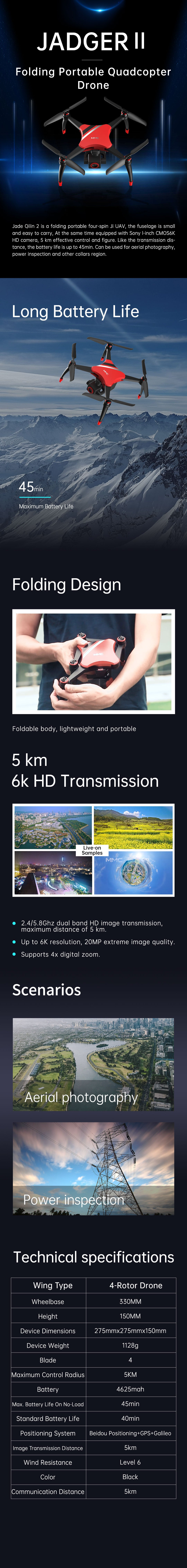 Jade Qilin 2 is a folding portable four-spin Ji UAV, the fuselage is small and easy to carry, at the same time equipped with Sont I-inch CMOS6K HD camera, 5km effective control and figure. Like the transmission distance, the battery life is up to 45min. Can be used for aerial photography, power inspection and other collars region.